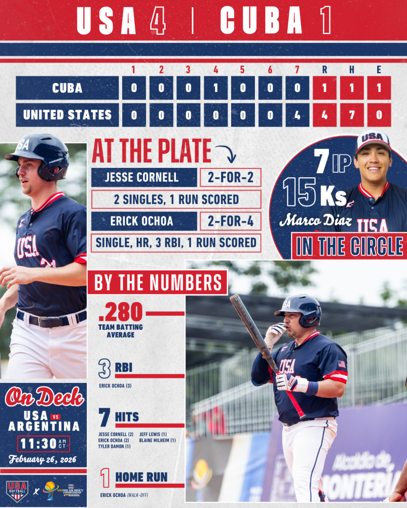 The U.S. Men’s National Team (MNT) delivered a dominant showing on the opening day of Super Round at the 2026 Men’s Pan American Championship, earning a pair of victories over Panama (4-0) and Cuba (4-1) to improve to 4-1 overall. The win over Cuba marked Team USA’s fourth-straight victory of the tournament and featured late-game heroics, as Erick Ochoa launched a three-run walk-off home run in the bottom of the seventh to seal the comeback win.