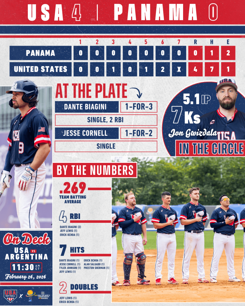Jon Gwizdala earned the start in the circle against Panama, tossing 5.1 innings with seven strikeouts before handing things over to Marco Diaz to record the final five outs — four via strikeout. The duo combined for 11 strikeouts, allowing just one hit and no runs. Keeping the momentum, Diaz took care of business in the circle against Cuba, striking out 15 batters through seven innings while allowing only one hit and issuing no walks. The U.S. pitching duo combined for 26 strikeouts while limiting opponents to just two hits on the day.