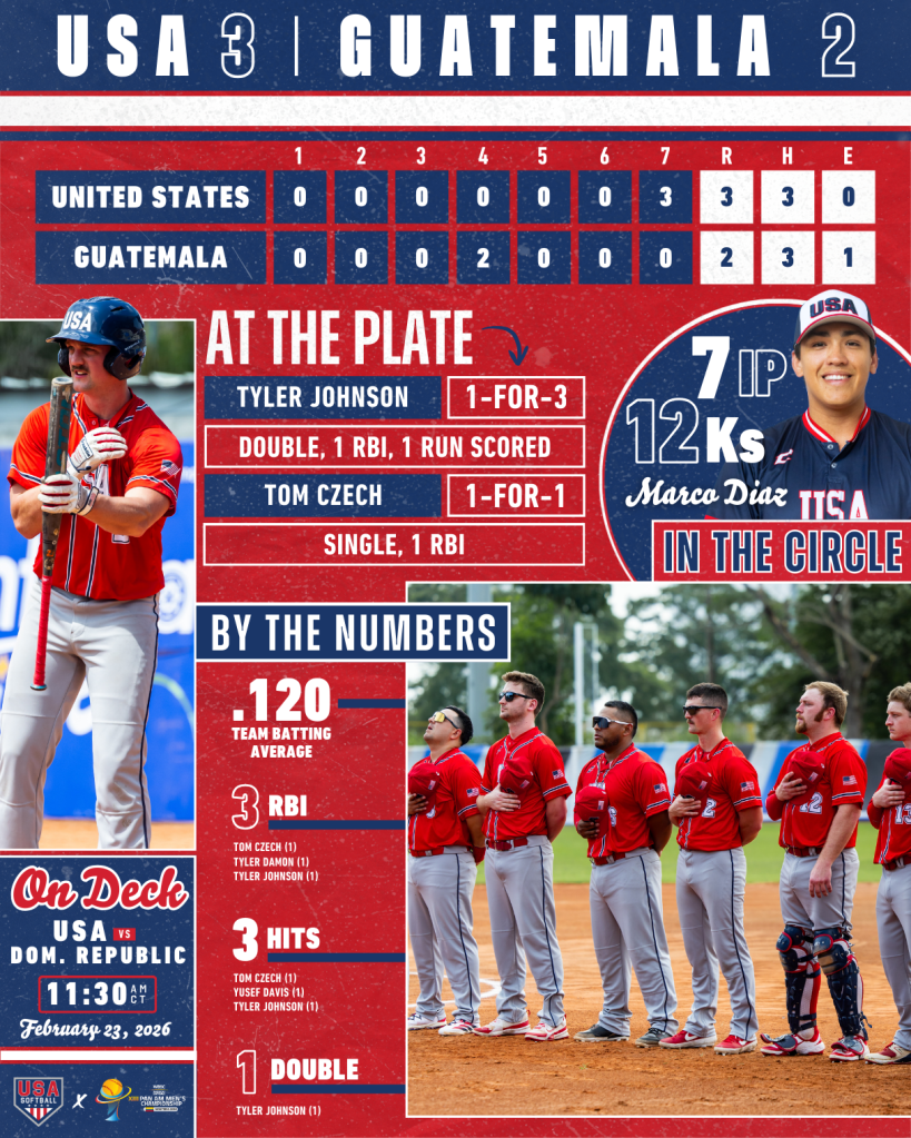 The U.S. Men’s National Team (MNT) clinched its first win of the 2026 Men’s Pan American Championship with a thrilling 3-2 comeback win over Guatemala, plating all three runs in the top of the seventh inning. Marco Diaz dominated in the circle, tossing 12 K’s through seven innings, while three U.S. batters recorded a hit in the matchup. Team USA will wrap up Opening Round tomorrow against the Dominican Republic at 12:30 p.m. local / 11:30 a.m. CT.