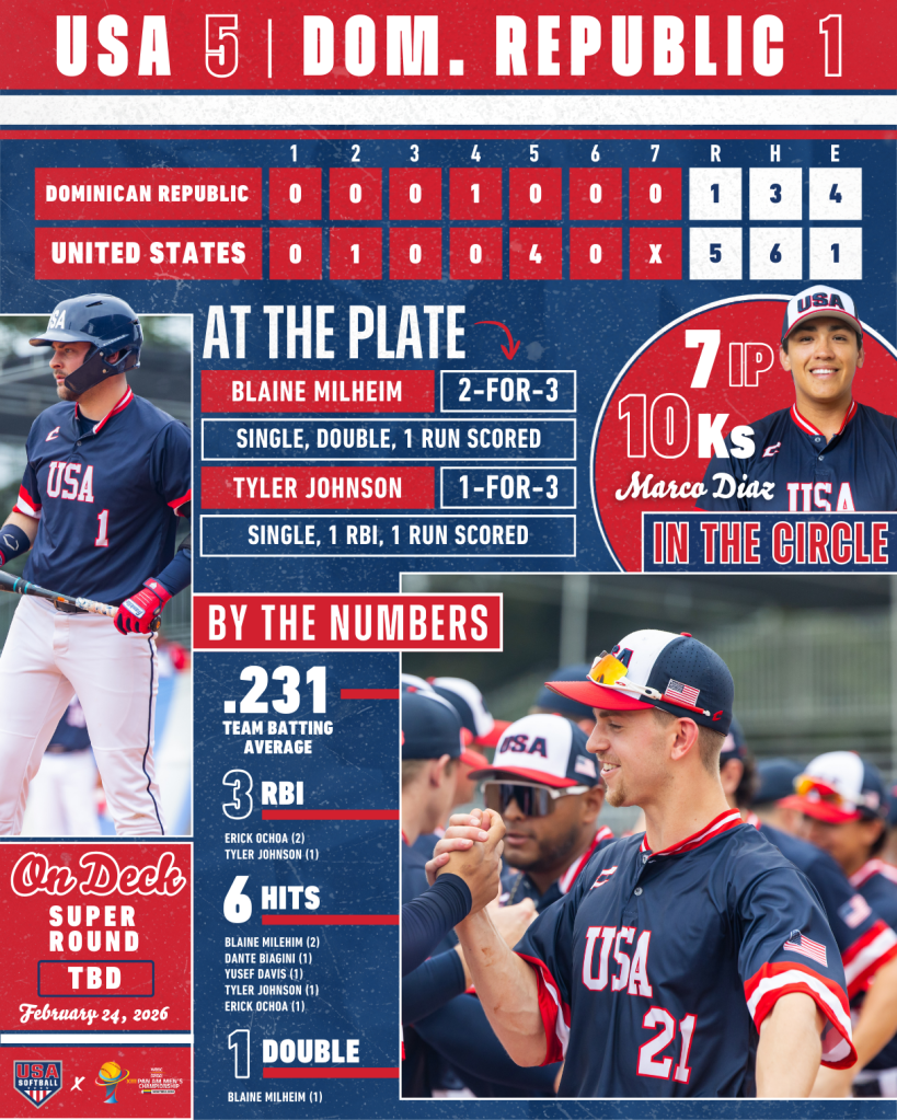 Five U.S. batters recorded a hit in the win, highlighted by a 2-for-3 performance from Blaine Milheim, who tallied the Eagles’ lone multi-hit effort. Marco Diaz got the start in the circle for the Red, White and Blue, striking out 10 across seven innings of work. With today’s victory, Team USA advances to the Super Round and moves one step closer to the podium.